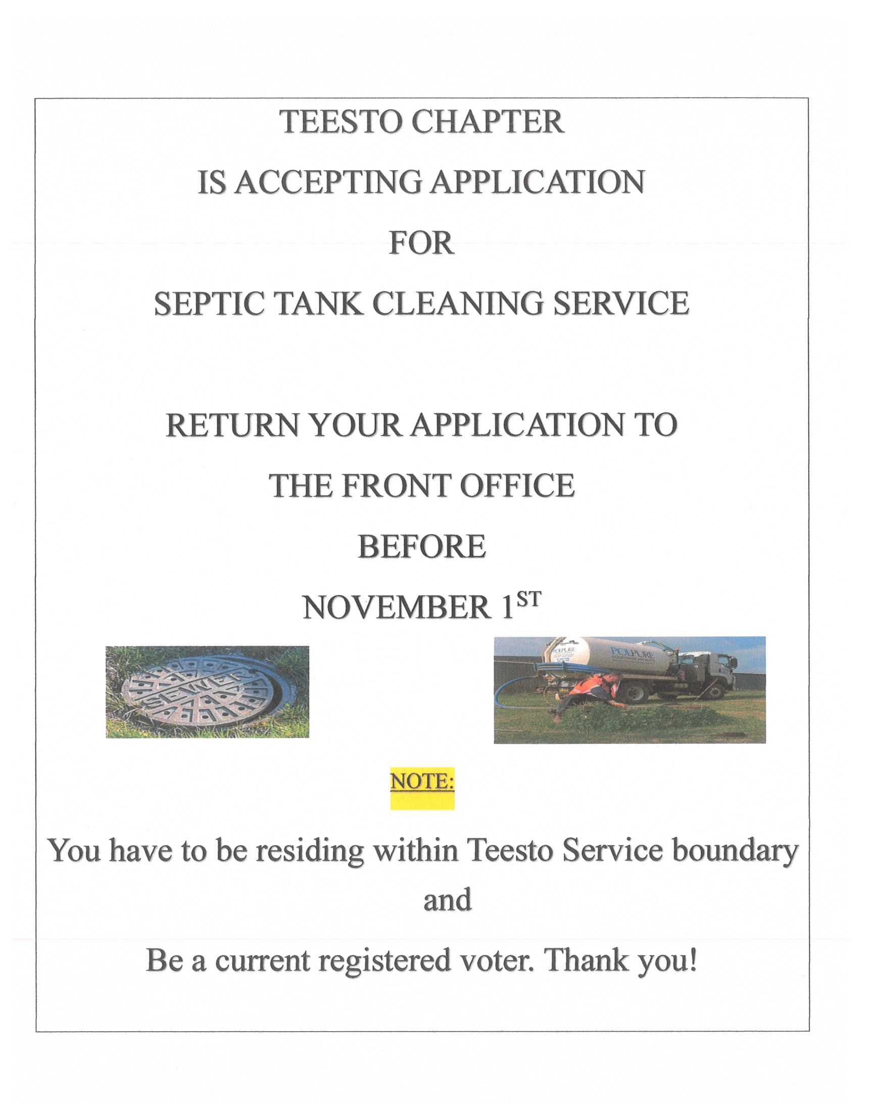 Teesto Chapter Heavy Equipment work orders & Water Delivery are put on hold until further notice. If you have any question, please give us a call @ (928) 657-8042 or via email, teesto@navajochapters.org